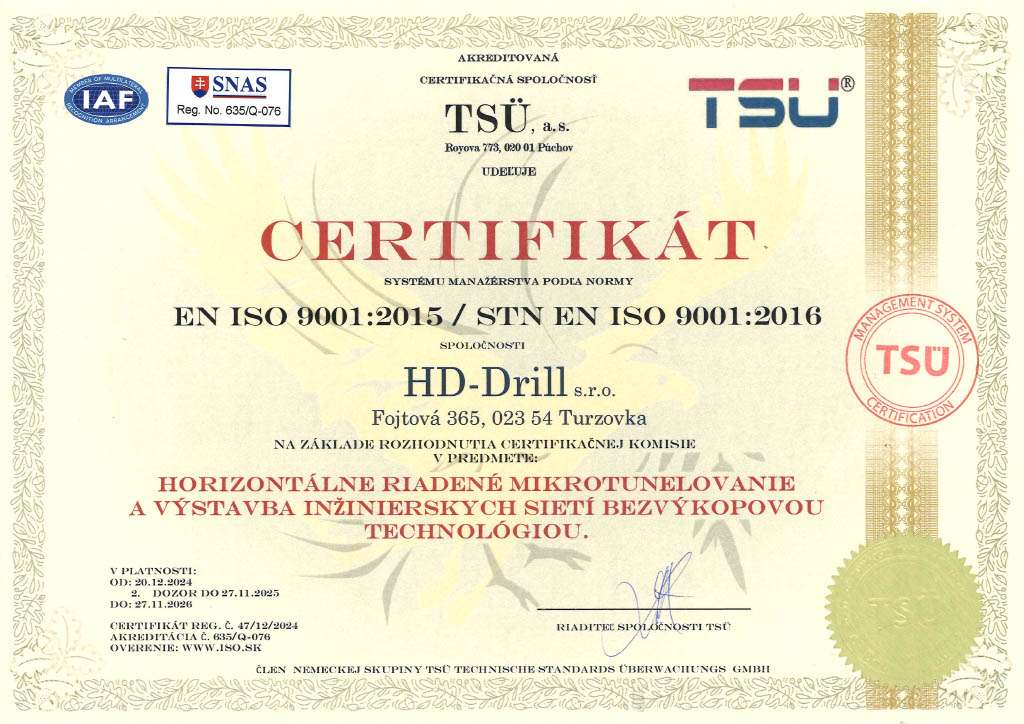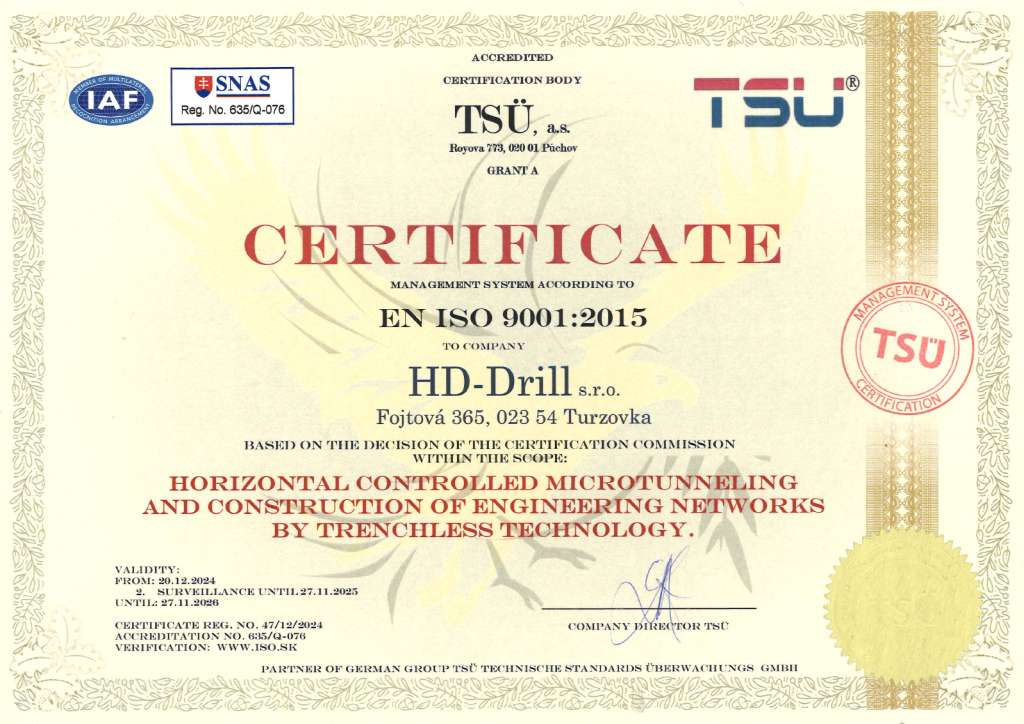HD-Drill s.r.o. is certified by TSÜ, a.s. according to Company Quality Management System EN STN ISO 9001:2015 with the scope – horizontal controlled microtunneling and construction of engineering networks by trenchless technology